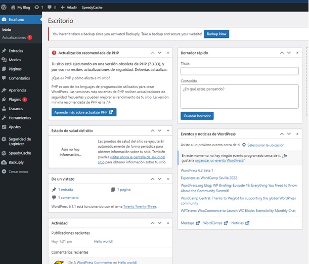 Actualizaciones: “Si hay una actualización disponible, aparecerá una notificación en la barra de herramientas y en el menú de navegación. Mantener tu sitio actualizado es importante para la seguridad. También hace que internet sea un lugar más seguro para ti y tus lectores”.